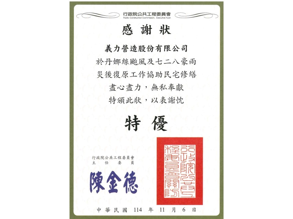 【114年】榮獲 公共工程委員會 感謝狀 特優