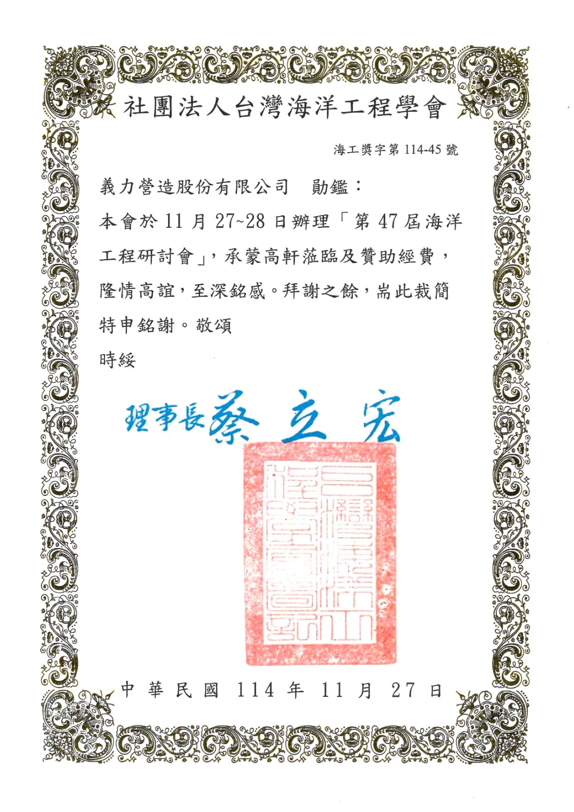 [114年]社團法人台灣海洋工程學會感謝狀