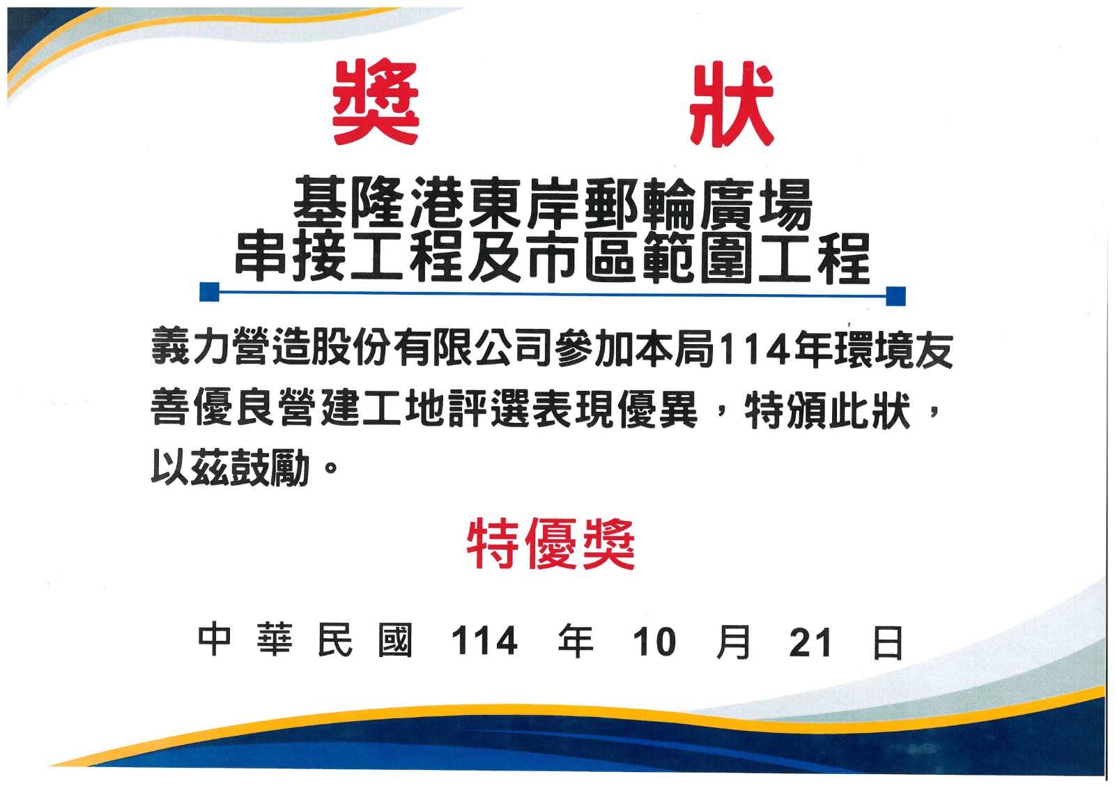 [114年]基隆市環保局環境友善優良營建工地評選獎-特優獎/基隆港東岸郵輪廣場串接工程及市區範圍工程