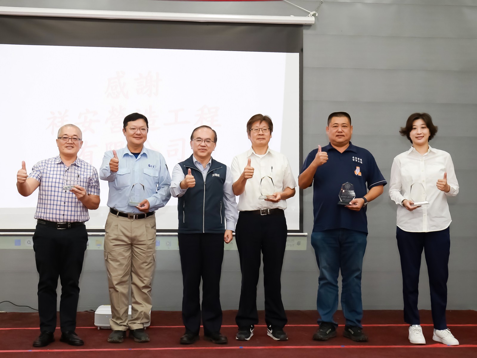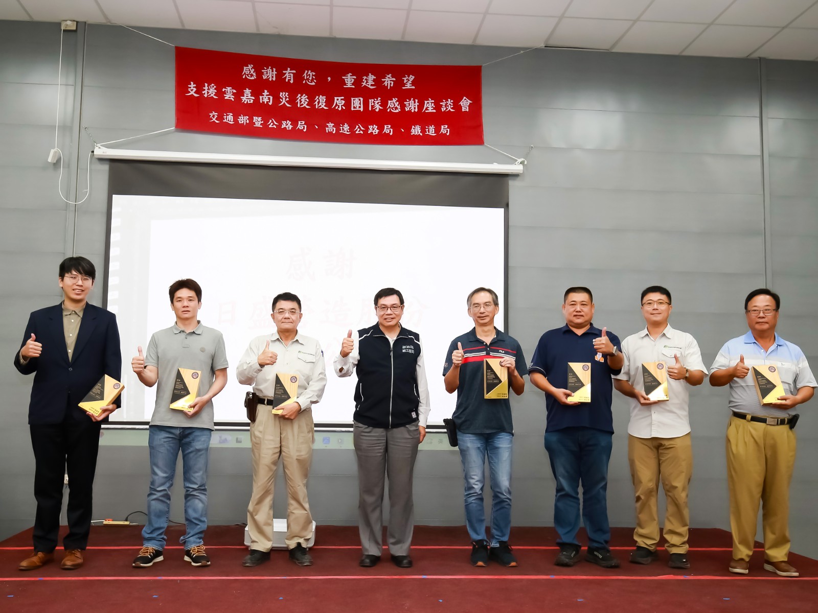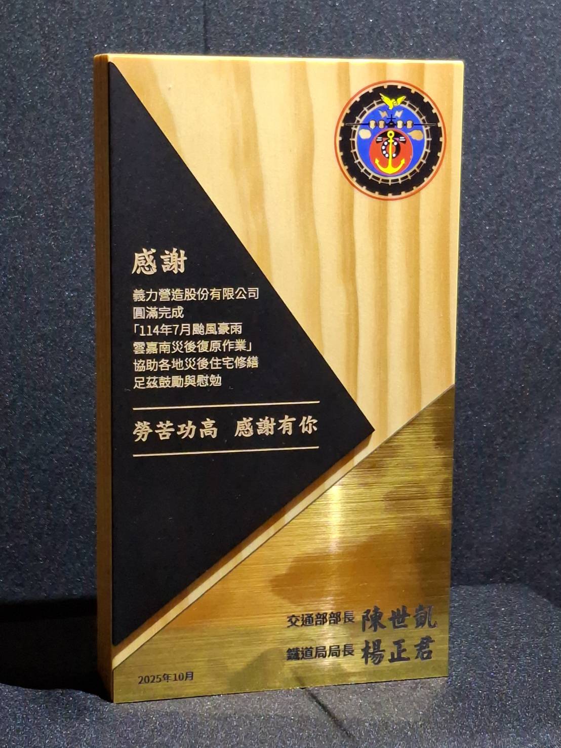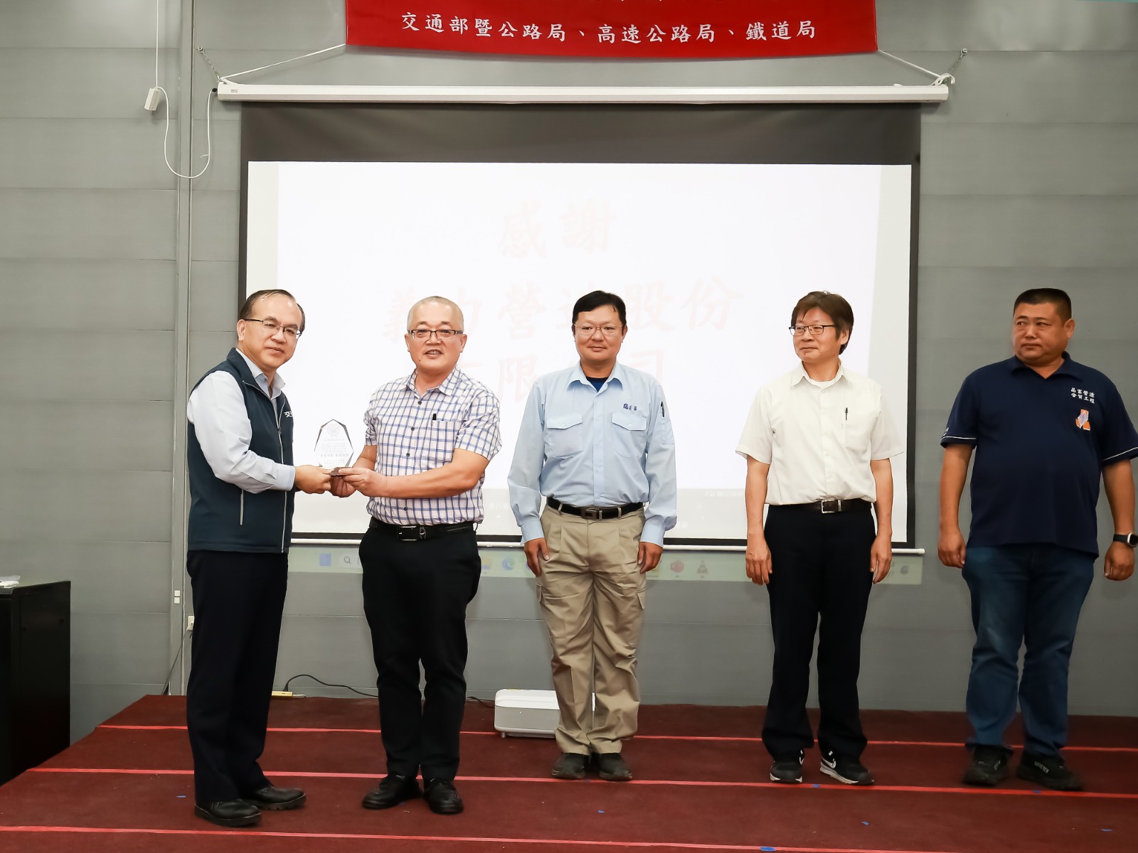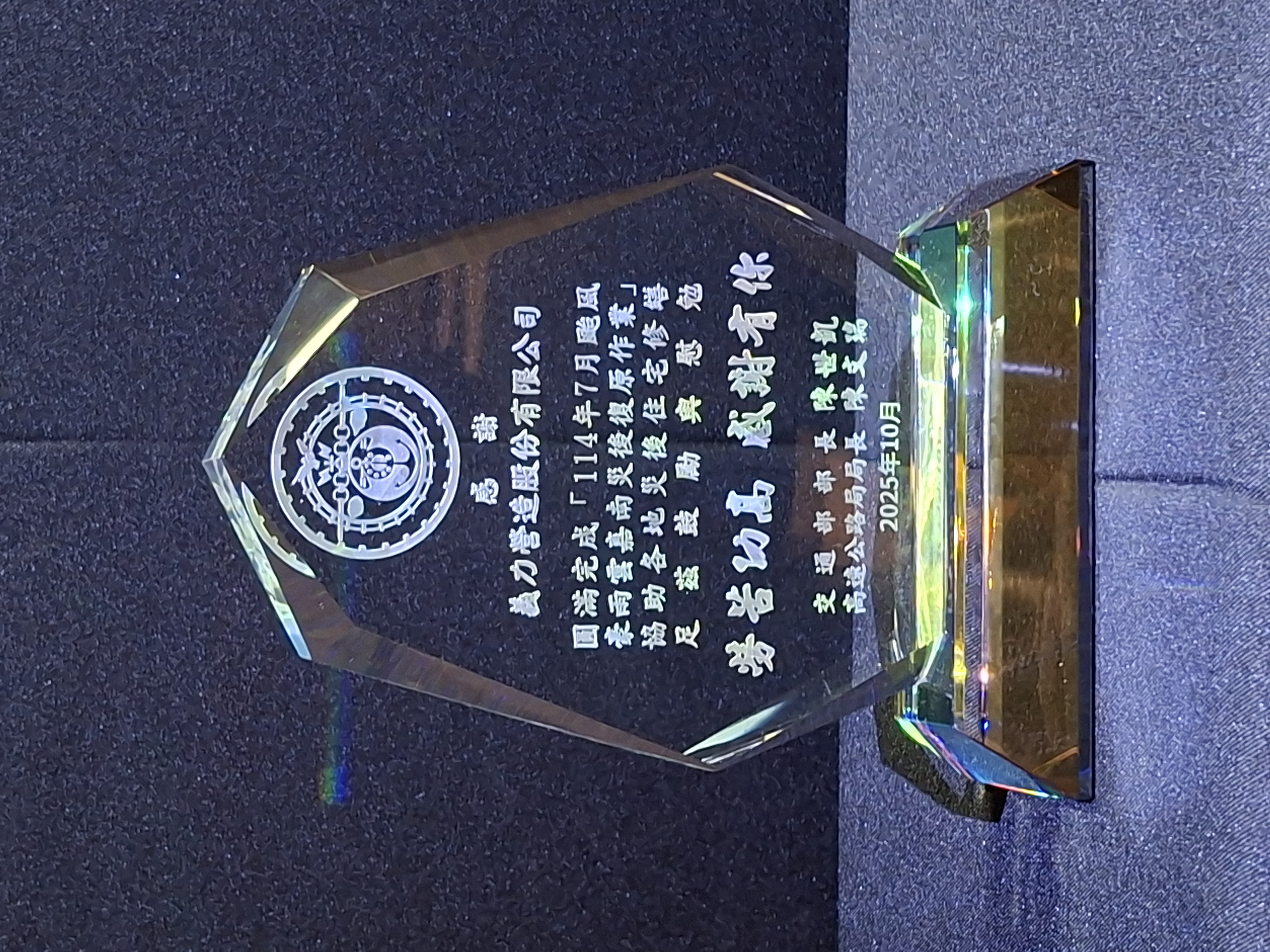 本公司由劉董事長代表受領,並分享這段期間團隊的辛勞與感動。同日,鐵道局總工程司亦頒發「協助鐵道局救災獎座」,由 陳資深經理代表公司受領,再次肯定我們在災後動員上的貢獻。